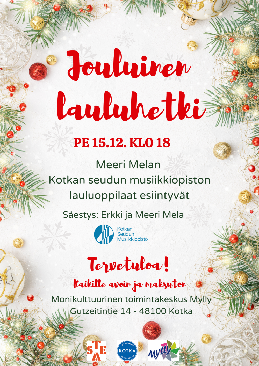 Meeri Melan Kotkan seudun musiikkiopiston lauluoppilaat esiintyvät Myllyssä. Säestys: Erkki ja Meeri Mela. Kaikille avoin ja maksuton. Tervetuloa!