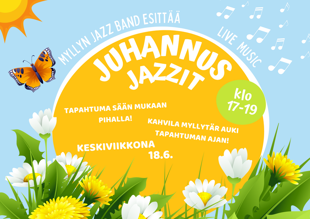 Juhannus Jazz tarjoaa tilaisuuden nauttia jazzmusiikista kesäisessä ympäristössä! Jos sää sallii musiiki koetaan pihalla, muuten jazzia pääsee kuuntelemaan Myllyn päärakennukseen!