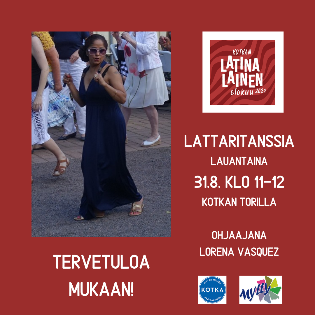 Tule mukaan tanssimaan lattareita la 31.8. klo 11-12 Kotkan kauppatorille. Ohjaajana Lorena Vasquez. Tervetuloa!